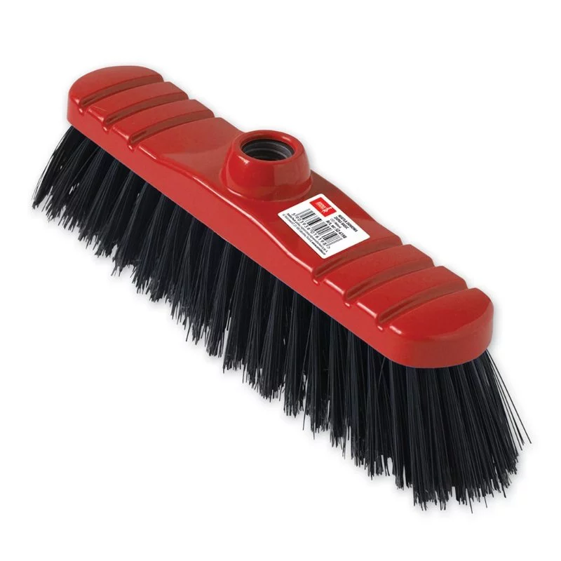 Tradycyjna miotła domowa z rozszczepionym na końcach syntetycznym włosiem i plastikową oprawą.- Uniwersalny gwint