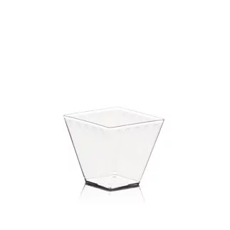 Elegancki plastikowy pojemnik na przekąski, z geometrycznymi zdobieniami. Pojemność od 58 cm3 do 320 cm3. Dostępne w różnych modelach, z których wszystkie można wyposażyć w pokrywkę.