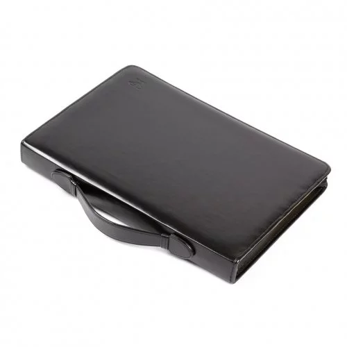 Bardzo poręczna i jednocześnie pojemna aktówka biznesowa. Posiada bogaty zestaw kieszeni i uchwytów przystosowanych do przechowywania najpotrzebniejszych dokumentów. Po otwarciu, po lewej stronie znajdziemy obszerną kieszeń przeznaczona na dokumenty formatu A4. Na niej naszyta została płaska kieszeń zamykana na zamek błyskawiczny dla dokumentów nieco mniejszego formatu. W dalszej kolejności mamy kieszeń do przechowywania pieczątki firmowej, uchwyty na trzy długopisy lub pisaki oraz aż cztery kieszonki na wizytówki. Kieszonki zostały wyprofilowane w taki sposób aby dostęp do wizytówek był maksymalnie wygodny. Wewnętrzna część grzbietu produktu wyposażona została w poczwórny ring do wpinania dokumentów. Po prawej stronie umieszczono metalowy klip na najważniejsze notatki lub notes.