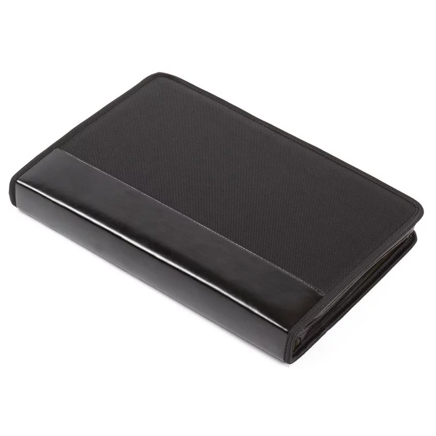Jest to jedna z naszych najpopularniejszych aktówek. Cechuje się niestandardowym wnętrzem poprzez umieszczenie wkładki z naszytymi kieszonkami na wizytówki, uchwytami na długopisy lub pisaki oraz okno personalizacyjne. Wkładka ta tworzy kieszeń na dokumenty, które możemy wkładać zarówno od góry jak i z boku. Poza tym w standardowym wyposażeniu aktówki znajduje się poczwórny ring na wkładki foliowe do segregatora oraz klip do mocowania najważniejszych notatek.