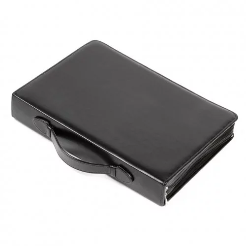 Bardzo pojemna aktówka wyposażona aż w trzy kieszenie formatu A4. Pozwalają na przechowanie kilkudziesięciu kartek dokumentów. Na kieszeniach umieszczono zakładki na wizytówki oraz przezroczystą kieszeń do personalizacji produktu. Całość uzupełniają trzy uchwyty na długopisy/pisaki. W wewnętrznej części grzbietu umieszczono poczwórny ring na dokumenty przystosowane do wpinania. Aktówka posiada również metalowy klip umożliwiający umocowanie bieżących notatek.