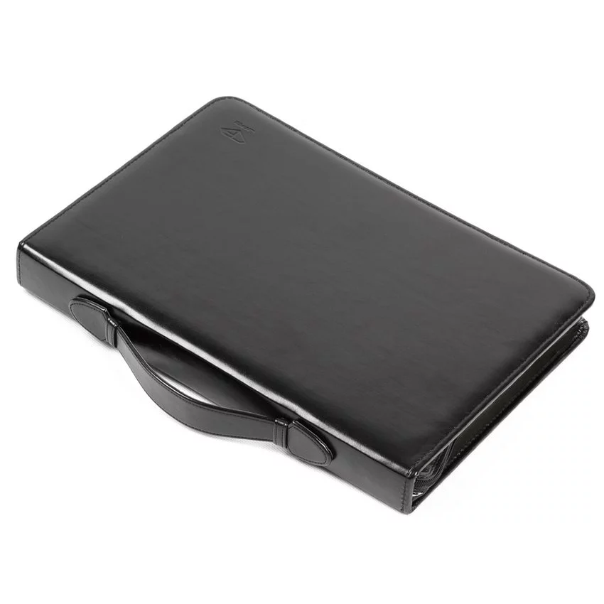 Całość zamykana jest na zamek błyskawiczny. Z zewnątrz aktówka jest gładka, bez przeszyć. Wyposażona jest w uchwyt stylizacją nawiązujący do innych aktówek z naszej serii.