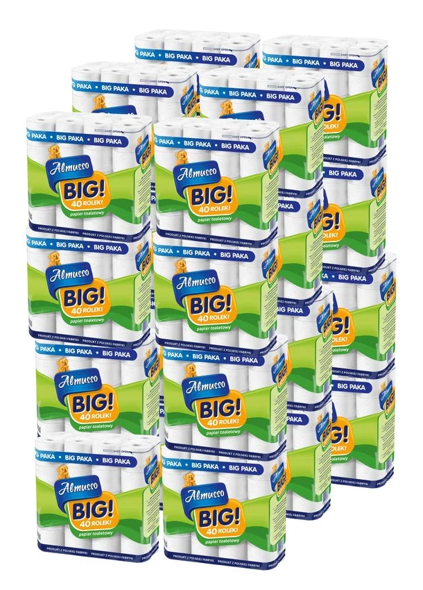 Almusso BIG! to duża ekonomiczna paczka trzywarstwowego papieru toaletowego w którym połączono komfort użytkowania oraz oszczędność w jednym. Celuloza, pochodzi z certyfikowanych źródeł odnawialnych plantacji drzew, a folia podlega w 100% recyklingowi