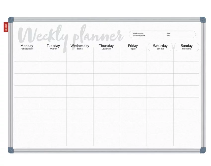 - Tablica z powierzchnią suchościeralno-magnetyczną z nadrukowanym terminarzem do planowania zadań tygodniowych