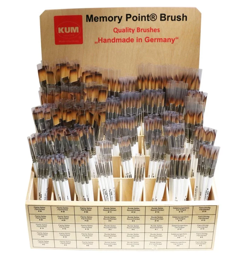 Display pędzli artystycznych KUM z serii Memory Point 222 szt. Ręcznie wykonane w Niemczech ze specjalnie opracowanego, zaawansowanego technologicznie włókna naturalnego. Oferują szczególnie pożądane cechy i właściwości, przewyższające oczekiwania każdego profesjonalisty i amatora. Włókna Memory Point zachowują wysoką elastyczność i trwałość, dzięki czemu końcówka zawsze powraca do swojej pierwotnej formy, nawet po wielokrotnym użyciu. Idealnie wyprofilowany kształt umożliwia niezwykle precyzyjną pracę i malowanie najdrobniejszych detali każdym rozmiarem i rodzajem pędzla. Zapewniają optymalne wchłanianie farby i wody oraz doskonałe rozprowadzanie koloru, co umożliwia tworzenie równych powierzchni, przejść kolorów i gradientów. Biały, okrągły uchwyt o gładkiej powierzchni wygodnie leży w dłoni i szczególnie nadaje się do malowania przy stole. Umożliwiają również uzyskanie przejść od cienkich do grubszych linii i wypełnienie większych obszarów. Pod zwiększonym naciskiem włosie rozszerza się, dzięki czemu możliwe jest uzyskanie szerszych linii, a przy zmniejszeniu nacisku końcówka wraca do poprzedniego kształtu. W skład displaya wchodzą 4 rodzaje pędzli: - płaskie (ze zwężaną końcówką, odpowiednie do malowania dużych powierzchni i rozprowadzania farby), - okrągłe (ze spiczastą, cienką i precyzyjną końcówką, odpowiednie do malowania najdrobniejszych szczegółów, wypełniania powierzchni i przejść od szerszych do węższych elementów), - skośne (szczególnie polecane do malowania różnego rodzaju kresek, linii i wzorów),- koci język (łączy zalety pędzli płaskich i okrągłych - szeroki, zwężający się kształt pozwala na równomierną aplikację i płynne połączenie kolorów, malowanie detali i linii oraz okrągłych i owalnych kształtów)Pędzle Memory Point są wszechstronne i idealnie nadają się do wielu zastosowań.Display zawiera po 6 szt. pędzli:- 511.48.11 Memory Point płaski No. 2 - 511.49.11 Memory Point płaski No. 4 - 511.50.11 Memory Point płaski No. 6 - 511.51.11 Memory Point pł