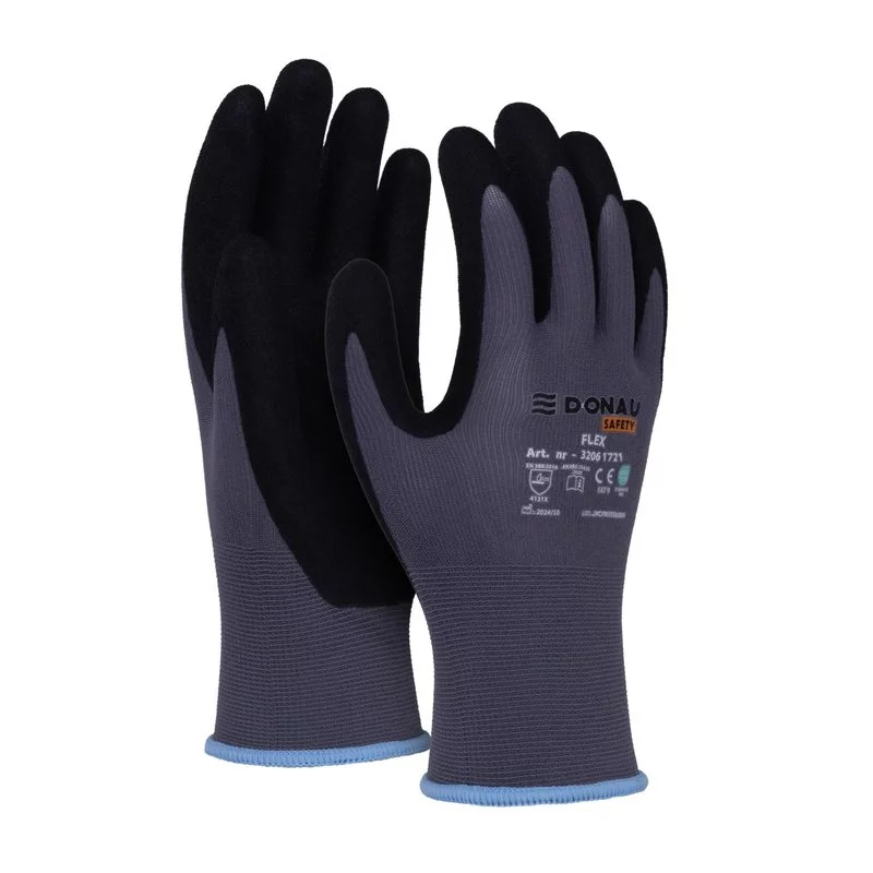 Rękawice ochronne Donau Safety Flex Kat. II w rozmiarze 9 to idealne połączenie nowoczesnych materiałów, wysokiej odporności i wygody użytkowania. Wykonane z trwałej, elastycznej dzianiny nylonowej z dodatkiem elastanu w kolorze szarym, zostały powleczone w części chwytnej ultradrobną czarną pianką nitrylową. Zapewniają doskonałą przyczepność, maksymalną manualność oraz bardzo wysoką odporność na ścieranie, co czyni je niezastąpionym narzędziem w codziennej pracy.