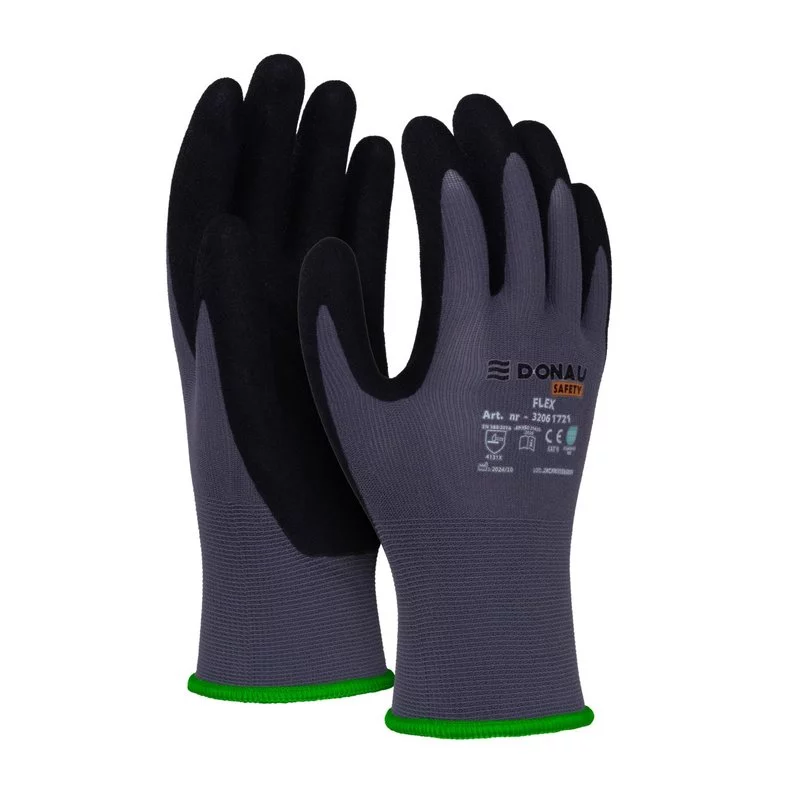 Rękawice ochronne Donau Safety Flex Kat. II w rozmiarze 11 to idealne połączenie nowoczesnych materiałów, wysokiej odporności i wygody użytkowania. Wykonane z trwałej, elastycznej dzianiny nylonowej z dodatkiem elastanu w kolorze szarym, zostały powleczone w części chwytnej ultradrobną czarną pianką nitrylową. Zapewniają doskonałą przyczepność, maksymalną manualność oraz bardzo wysoką odporność na ścieranie, co czyni je niezastąpionym narzędziem w codziennej pracy.