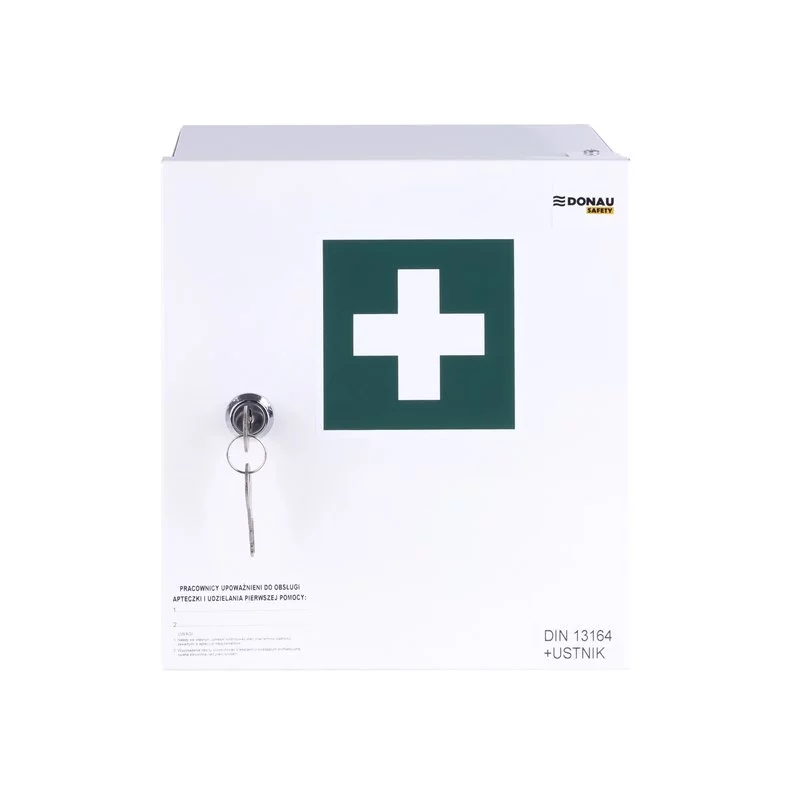 Donau Safety 20 +A to kompaktowa, metalowa apteczka ścienna przeznaczona do biur, warsztatów, hal produkcyjnych, magazynów i instytucji. Wykonana z trwałej, proszkowo malowanej blachy stalowej, zapewnia nie tylko solidność, ale również estetykę i bezpieczeństwo – dzięki zamknięciu na klucz.