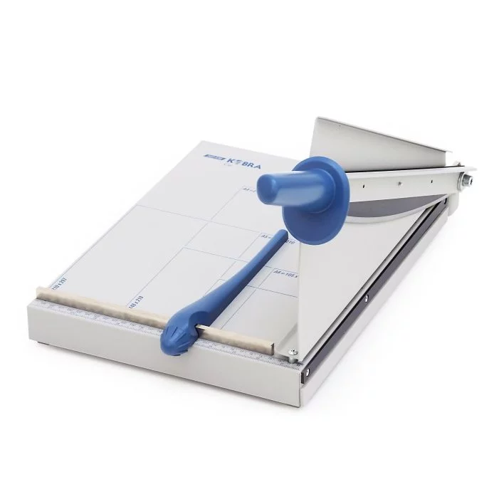 Gilotyna biurowa Kobra 360 EM z ręcznym systemem docisku papieru. Gilotynę wyposażono w osłonę gwarantującą bezpieczeństwo pracy, ergonomiczny uchwyt przeciwpoślizgowy zapewniający wysoki komfort użytkowania i ogranicznik do regulacji wymiarów cięcia. Dodatkowo gilotyna posiada standardowe szablony formatów na blatach roboczych. Długość cięcia gilotyny wynosi 360mm. Jednorazowo urządzenie jest w stanie przeciąć do 20 kartek 70g.- ilość ciętych kartek: 20
