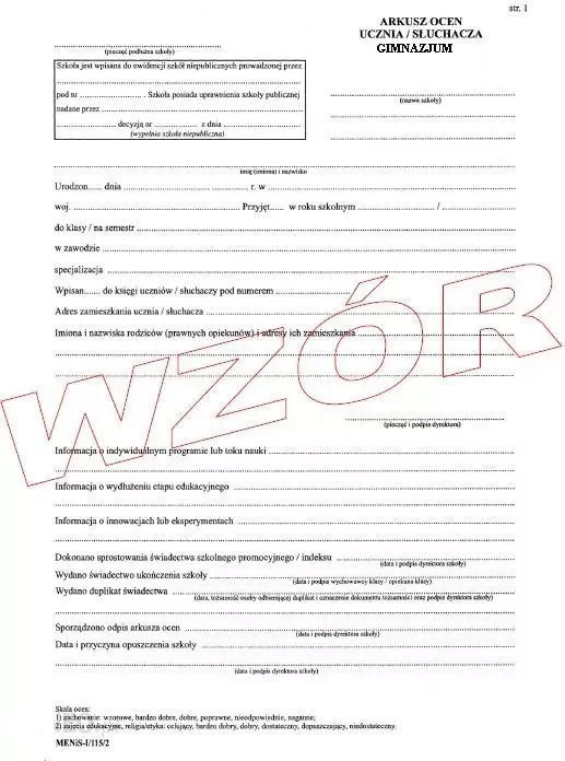 Arkusz Ocen MEN-I/40/2 dla Uczniów z Upośl. Gimnazjum /W-X