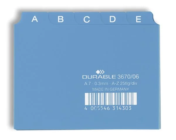 Przekładki do Kartotek A-Z 5/5 PCW 0,3mm Indeksy 20mm Poziome A7 25szt. Niebieskie /Durable 367006