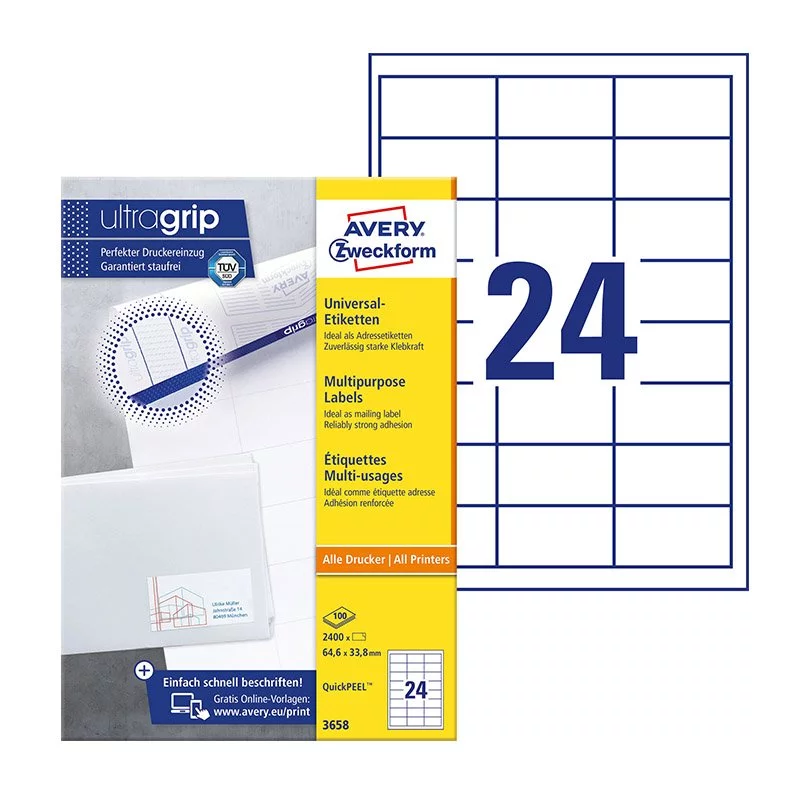 - Etykiety samoprzylepne, uniwersalne Avery Zweckform QuickPeel 3658 w kolorze białym. Łatwe w przyklejaniu i odklejaniu. Gwarancja trwałego, odpornego na ścieranie druku. Do zastosowania w drukarkach laserowych oraz kopiarkach.
