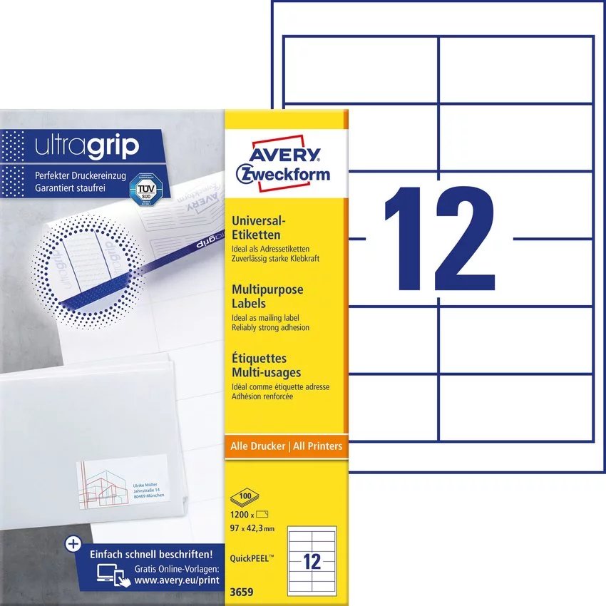 - Etykiety samoprzylepne, uniwersalne Avery Zweckform QuickPeel 3659 w kolorze białym. Łatwe w przyklejaniu i odklejaniu. Gwarancja trwałego, odpornego na ścieranie druku. Do zastosowania w drukarkach laserowych oraz kopiarkach.