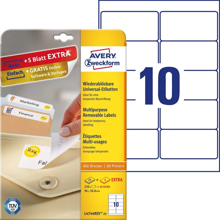 - Etykiety, samoprzylepne, usuwalne Avery Zweckform L4744REV-25. Do drukarek laserowych i kopiarek. Bardzo wytrzymałe i odporne na podarcie. Nie pozostawiają śladów kleju.