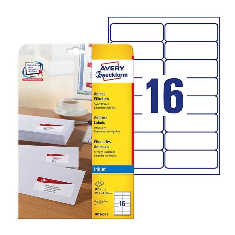 Samoprzylepne etykiety adresowe Avery 99.1x33.9 16/A4 A'25 białe No.J8162-25
