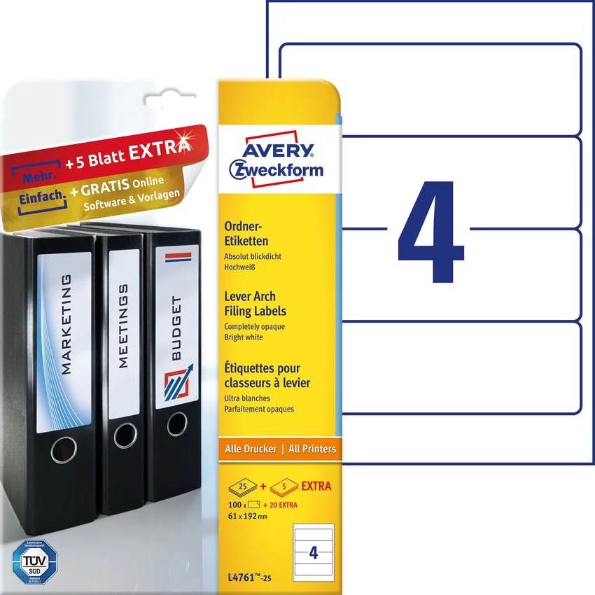 - Etykiety samoprzylepne do segregatora Avery Zweckform L4761-25, kolor biały. Mocno kryjące. Idealne do oznaczania zawartości segregatorów. Do drukarek atramentowych, laserowych oraz kopiarek.