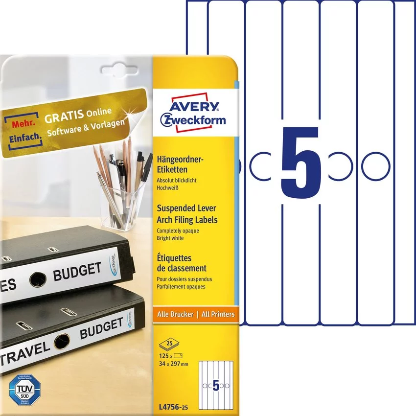 - Etykiety samoprzylepne do segregatora podwieszanego Avery Zweckform L4756-25, kolor biały. Mocno kryjące. Idealne do oznaczania zawartości segregatorów. Do drukarek atramentowych, laserowych oraz kopiarek.