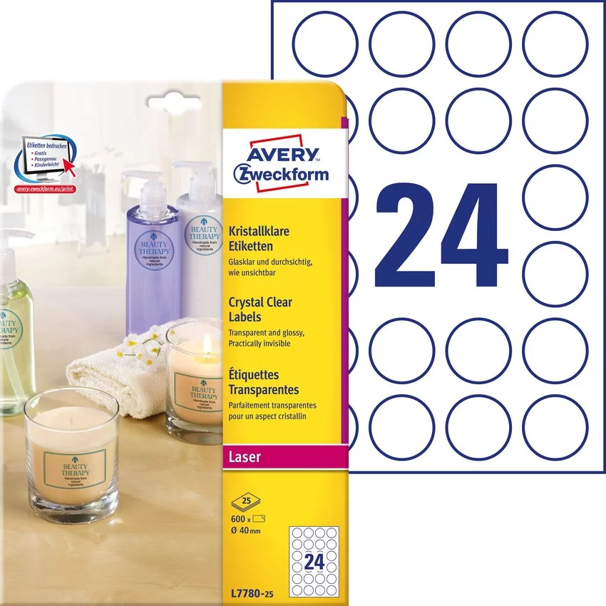 Etykiety Błyszczące Crystal Clear Okrągłe Avery śr. 40mm 24/A4 A'25 Przezroczyste No.L7780-25