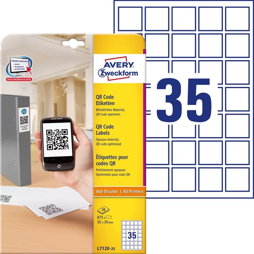 - Etykiety do kodów QR Avery Zweckform L7120-25 w kolorze białym. Stworzone specjalnie do druku kodów QR. Kryjący materiał BlockOut sprawi, iż bez problemów zeskanujesz każdy wydrukowany na nich kod. Do drukarek atramentowych, laserowych oraz kopiarek.