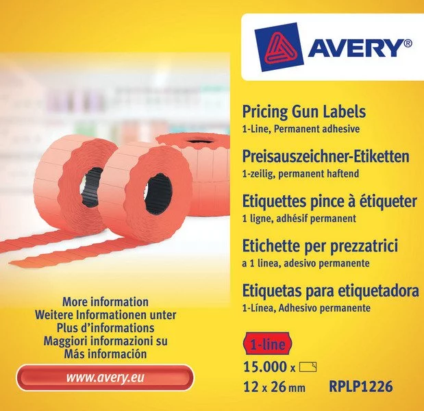 - Etykiety cenowe do metkownicy jednorzędowej Avery Zweckform RPLP1226, kolor czerwony. Papierowe, mocno przylegają do powierzchni. 10 rolek w opakowaniu.
