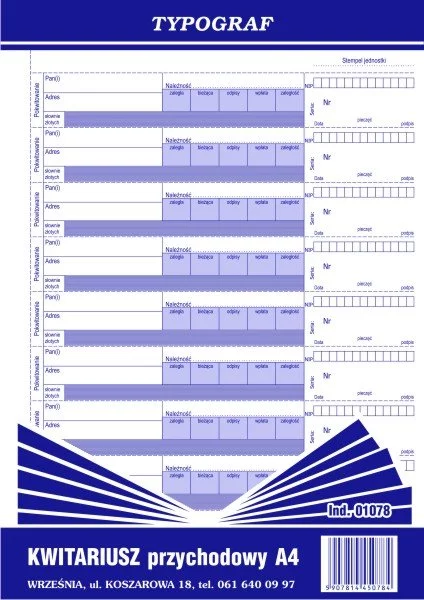 Kwitariusz Przychodowy A4 Oryg.+2k Numer. 01078 /Typograf