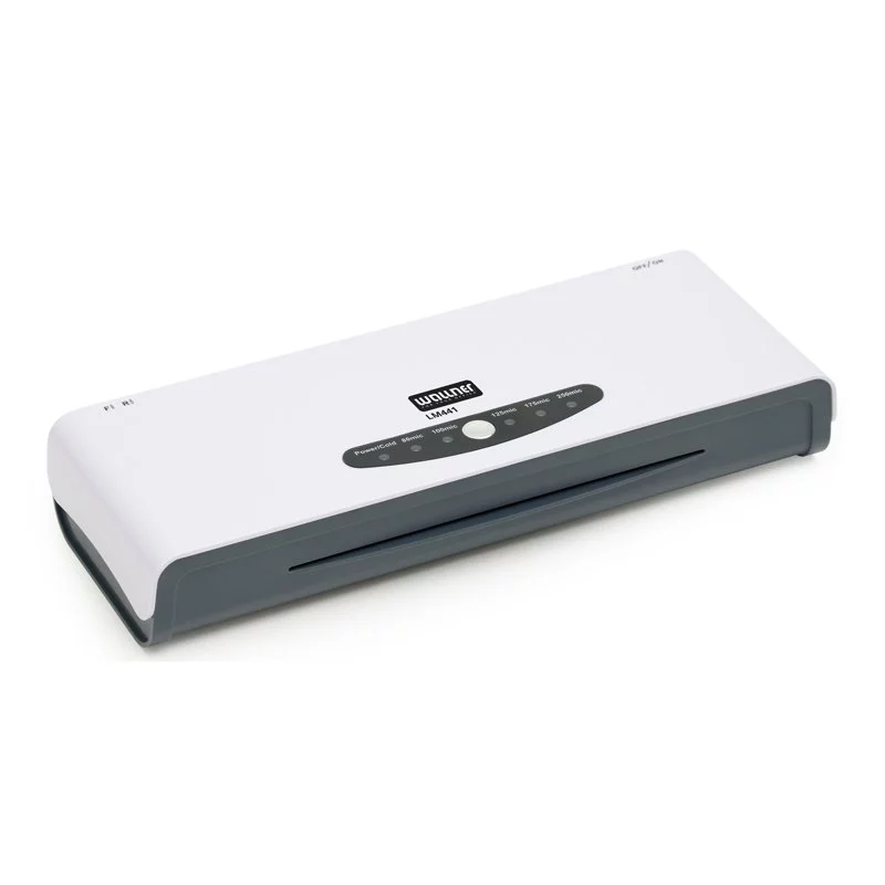 Laminator Wallner LM441 doskonale nadający się do biura. Możliwość laminacji na gorąco lub na zimno oraz doboru temperatury do grubości folii laminacyjnej. Laminator wyposażono w funkcję cofania, umożliwiającą wycofanie źle włożonej folii, diodę sygnalizującą osiągnięcie temperatury roboczej, technologię 4 gorących wałków (brak konieczności stosowania carriera). Laminator umożliwia laminację dokumentów o maksymalnej szerokości 240mm z prędkością 300mm/min. Maksymalna grubość folii laminacyjnej to 250 mikronów.- Dobór temperatury laminacji w zależności od grubości folii laminacyjnej.