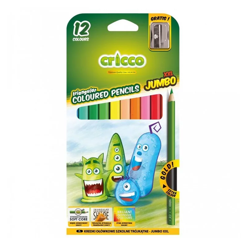 Kredki Ołówkowe Szkolne Trójkątne - Jumbo XXL/12 kol/z Temperówką Cricco