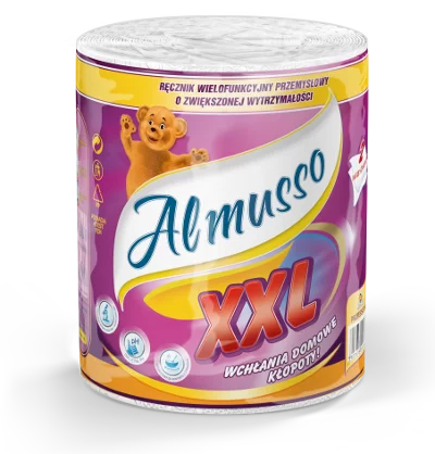 Duża rolka 2-warstwowego ręcznika papierowego, mocno nawinięta.