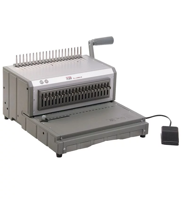 Najnowsza w ofercie bindownica elektryczna przeznaczona do oprawiania dokumentów grzbietem plastikowym. Polecana do dużych biur i punktów usługowych. Dzięki solidnej, metalowej konstrukcji urządzenie jest bardzo wytrzymałe ! Lekko działający mechanizm rozciągania grzbietów oraz przycisk nożny uruchamiający urządzenie sprawiają, że El-Jumbo B jest bardzo wygodna w obsłudze. Wyposażona jest w regulacje marginesu, ogranicznik formatu, wyłączane noże oraz duży pojemnik na ścinki. Ponadto posiada czytelny przymiar grubości grzbietów. Jest to następczyni cieszącej się dużym uznaniem wśród najbardziej wymagających klientów bindownicy EL-JUMBO.
