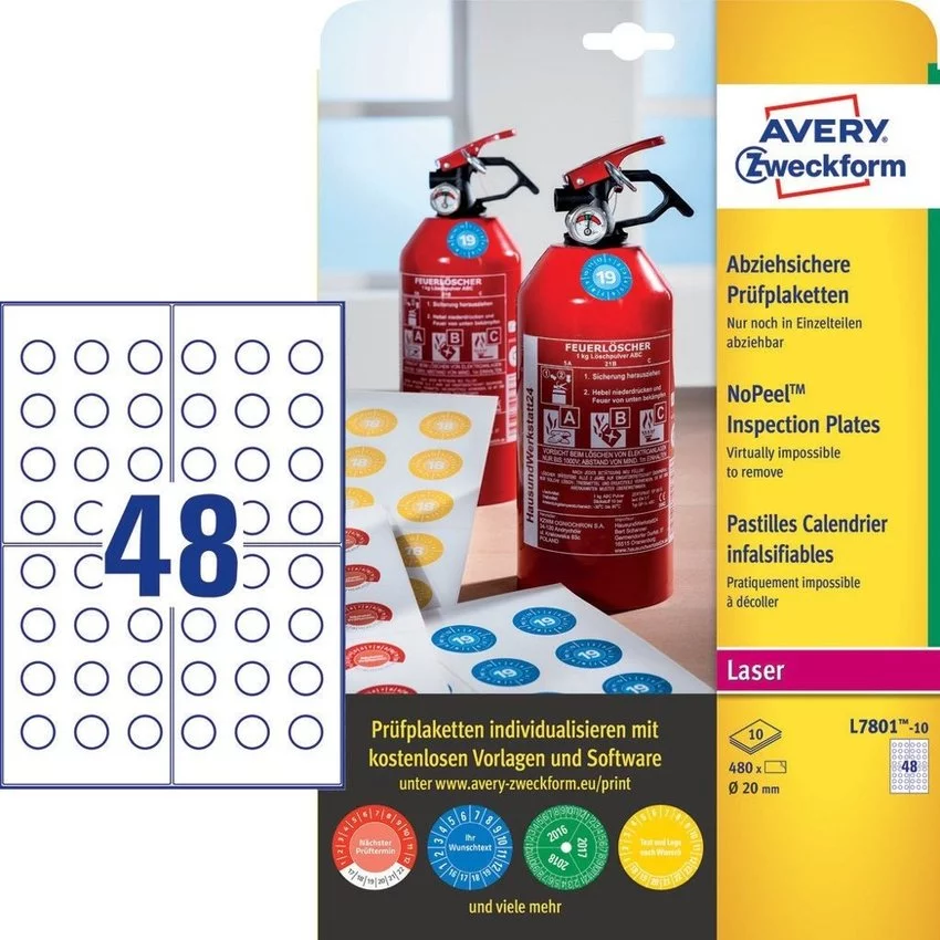 Etykiety Inspekcyjne NoPeel Avery Śr.20 10/A4 A'48 Białe No.L7801-10