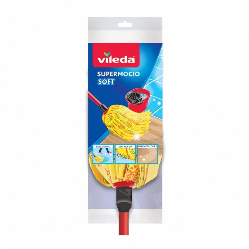 Mop Vileda Super Mocio Soft wykonany jest z włókien wiskozowych, lepiej wchlaniających brud i wilgoć. Nasada w profilu elipsy powiększa powierzchnię czyszczącą i zezwala na dotarcie w trudno dostępne miejsca jak kąty i narożniki. Wkład można prać w pralce w temperaturze 60 °C. Mop sprzedawany w pakiecie z drążkiem.- Drążek 130 cm z otworem do zawieszenia