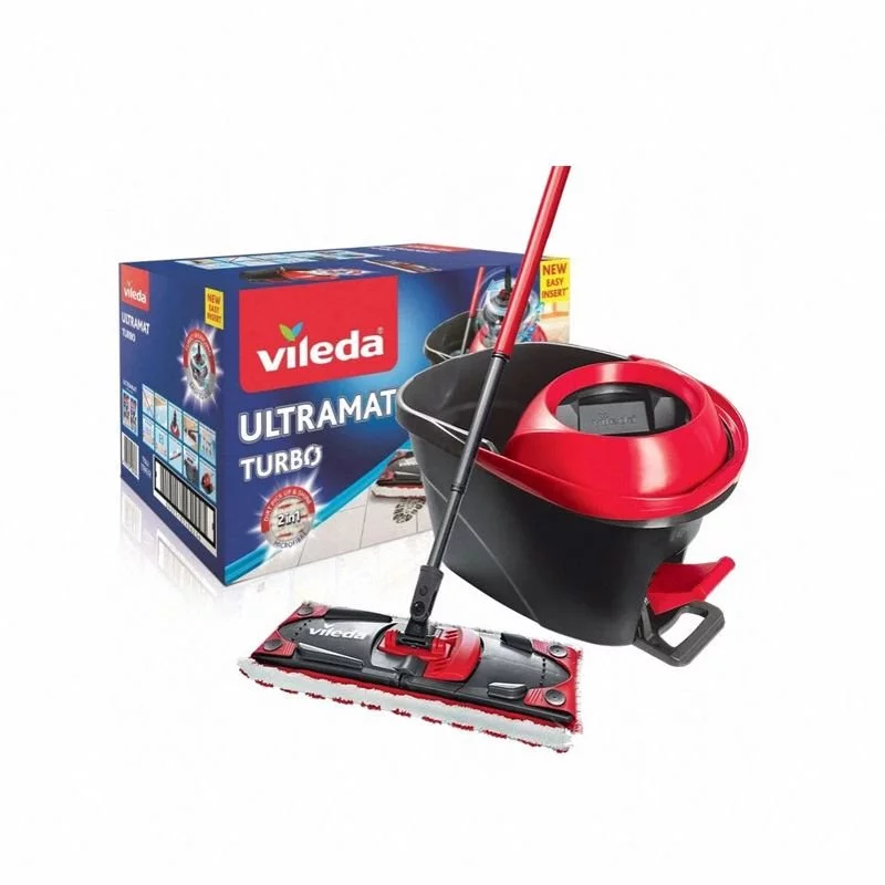 Mop Ultramat Turbo marki Vileda to nowa, ulepszona wersja wcześniejszego modelu Easy Wring Ultramat. Dzięki specjalnej budowie i ruchomemu przegubowi, mop może dotrzeć do trudno dostępnych miejsc pod meblami. Specjalne sito do odsączania nadmiaru wody sprawia, że czyszczenie podłóg nie wymaga moczenia rąk w brudnej wodzie.
