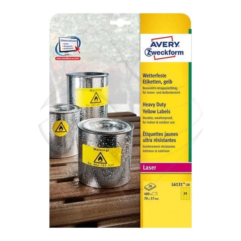 Etykiety Poliestrowe Wodoodporne Avery 70x37mm 24/A4 A'20 Żółte No.L6131-20