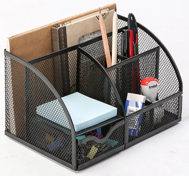 Ten organizer wykonano z trwałej siatki metalowej, którą dodatkowo pokryto lakierem. Idealnie nadaje się do przechowywania artukułów piśmeinnicznych, gumek, karteczek, korektorów, stempli itp. Z pewnością, sparwdzi się w kazdym biurze. Dzięi niemu, na blacie Twojego stolika zapanuje porządek. Wszystko będziesz mieć w zasięgu ręki i unikniesz gubienia się drobnych przedmiotów.