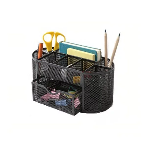 Ten organizer wykonano z trwałej siatki metalowej, którą dodatkowo pokryto lakierem. Idealnie nadaje się do przechowywania artukułów piśmeinnicznych, gumek, karteczek, korektorów, stempli itp. Z pewnością, sparwdzi się w kazdym biurze. Dzięki niemu, na blacie Twojego stolika zapanuje porządek. Wszystko będziesz mieć w zasięgu ręki i unikniesz gubienia się drobnych przedmiotów.