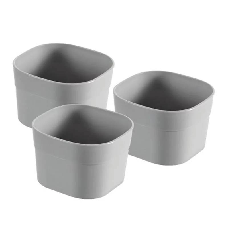 - Zestaw 3 organizerów w rozmiarze XS (8 x 8 x 5 cm) o kwadratowym kształcie i jasnoszarym, neutralnym kolorze.