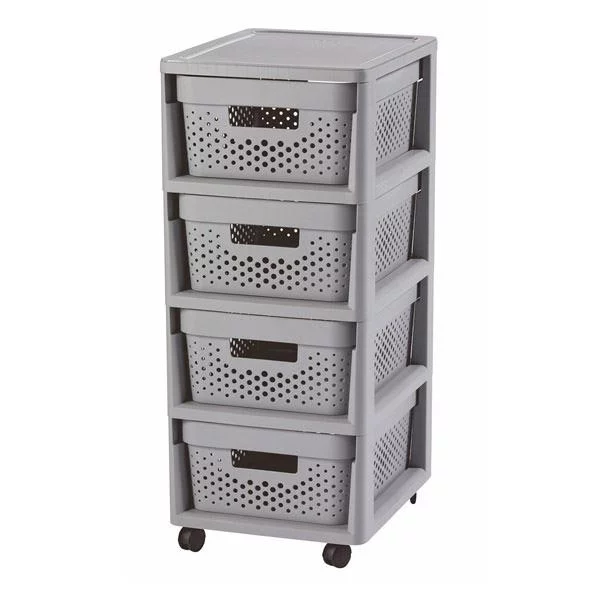 Regał Curver Infinity 4x10L wyróżnia się lekką i przewiewną konstrukcją, dzięki której utrzymanie porządku staje się łatwe i wygodne. Jego cztery szuflady w formie ażurowych koszy umożliwiają przechowywanie drobnych przedmiotów, a stabilny słupek z kółkami zapewnia mobilność i komfort użytkowania.
