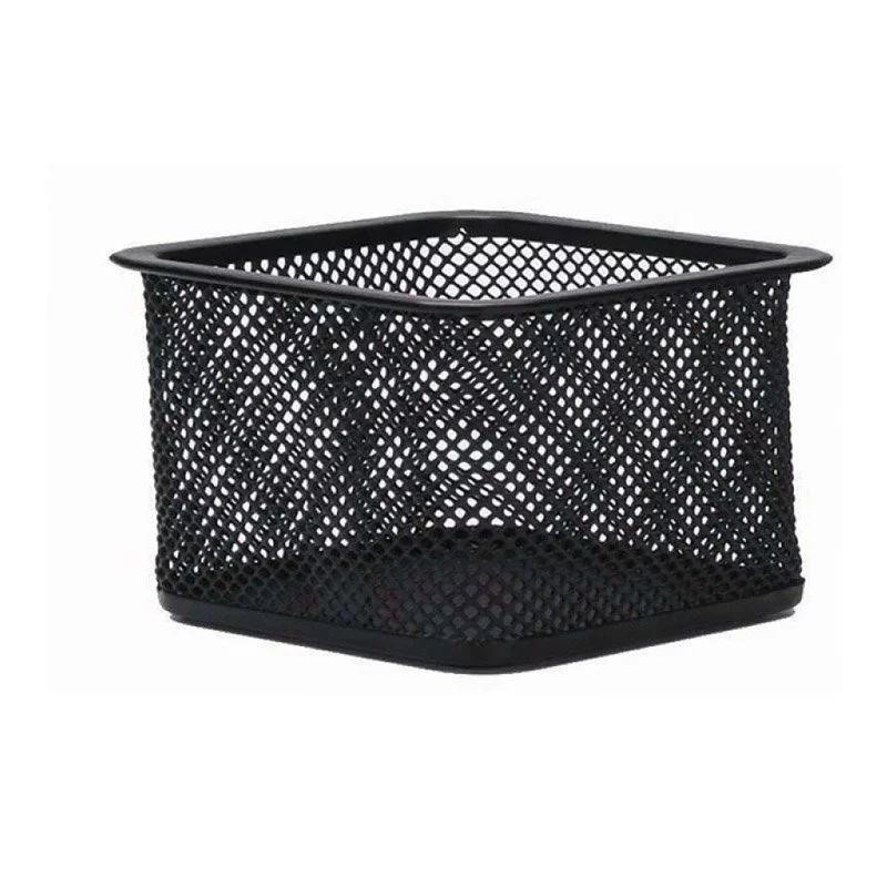 - kwadratowy pojemnik na spinacze wykonany z metalowej siateczki powlekanej lakierem