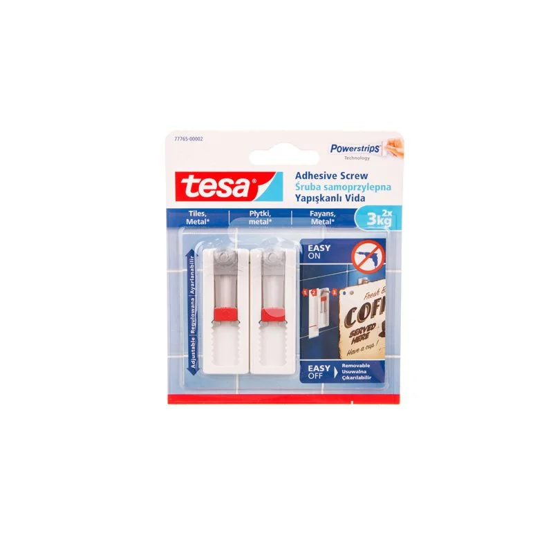 Samoprzylepna, praktyczna śruba montażowa Tesa z możliwością regulacji wysokości w pionie, pozwala na równe i proste montowanie bez konieczności wiercenia czy wbijania gwoździ. Specjalny design umożliwia przytwierdzenie dwóch śrub na raz, co dwukrotnie zwiększa udźwig z 3 do 6 kg. Ponadto śruba dzięki plastrom Powerstrips może być wykorzystywana wielokrotnie – wystarczy zakupić pudełko nowych plastrów. Niewątpliwie jest to doskonały sposób aby zaoszczędzić czas i energię.