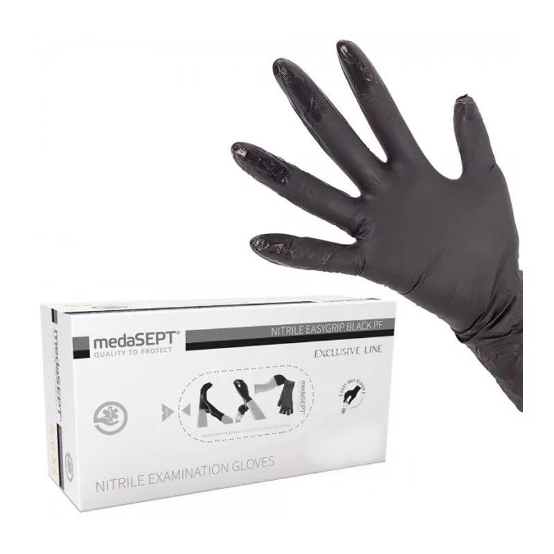 - Czarne, bezpudrowe rękawice nitrylowe Medasept, rozmiar L, diagnostyczne i ochronne (kat. III), z warstwą adhezyjną na końcach palców. Opakowanie 100 sztuk.