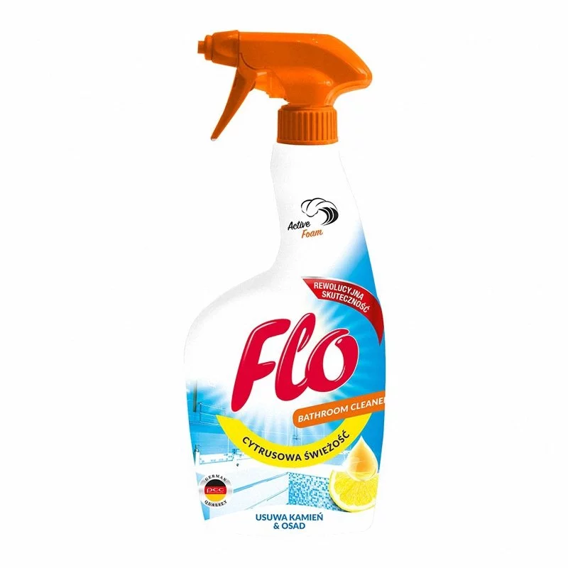 Flo Bathroom Cleaner to wygodny w użyciu spray przeznaczony do czyszczenia powierzchni zmywalnych w łazience. Dzięki specjalnej formule PRO ACTIVE FOAM płyn skutecznie usuwa kamień oraz osady z mydła. Przeznaczony jest do czyszczenia armatury łazienkowej, kabin prysznicowych, wanien i baterii ze stali nierdzewnej. Nie pozostawia smug na czyszczonej powierzchni. Nadaje powierzchniom przyjemny, odświeżający, cytrusowy zapach.