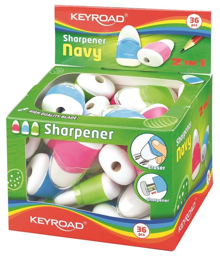 Temperówka Keyroad Navy Plastikowa Pojedyńcza Z Gumką Pakowane Na Displayu Mix Kolorów