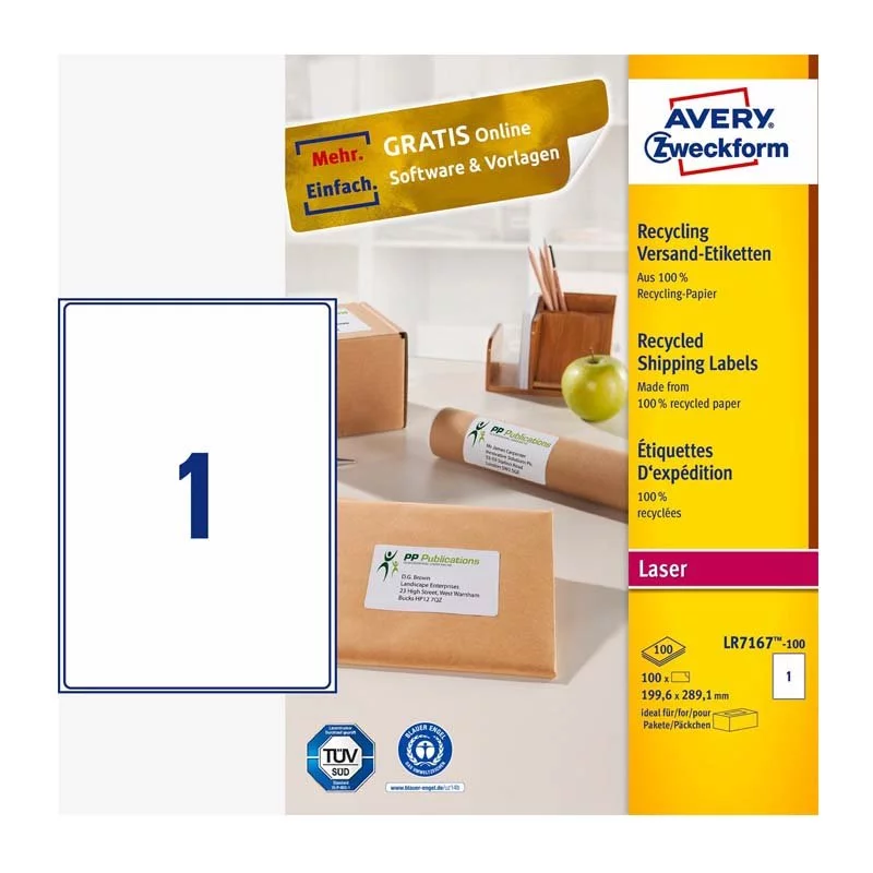 Naturalne białe etykiety adresowe LR7167-100 do drukarek laserowych w formacie 199,6 x 289,1 mm firmy AVERY ZWECKFORM są idealne do paczek i paczek. 100 naklejek na 100 arkuszach. Składają się one w 100% z bezchlorowego bielonego makulatury i posiadają certyfikat ekologiczny „Blue Angel”. Podczas produkcji nie występują emisje, a odpady produkcyjne są całkowicie poddawane recyklingowi. Łatwa przepustka do drukarek laserowych przetestowana i potwierdzona przez TÜV SÜD.