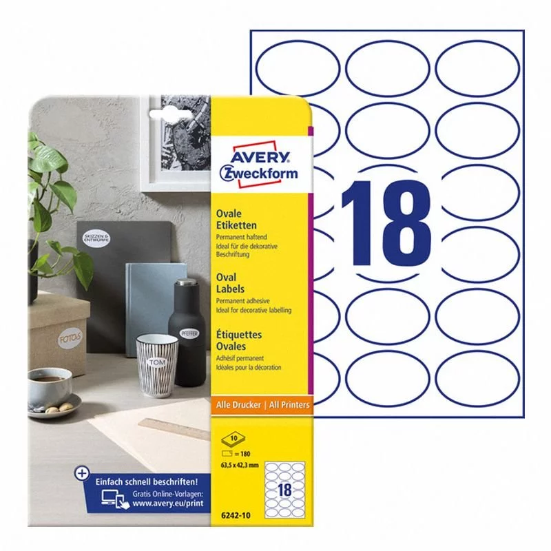 Etykiety Samop. Avery Owalne 63,5x42,3 18/A4 Trwałe Białe No.6242-10