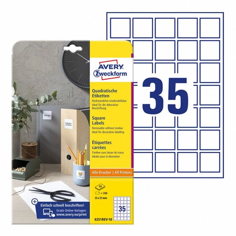 Etykiety Samop. Avery Kwadratowe 35x35 35/A4 Usuwalne Białe No.6251REV-10