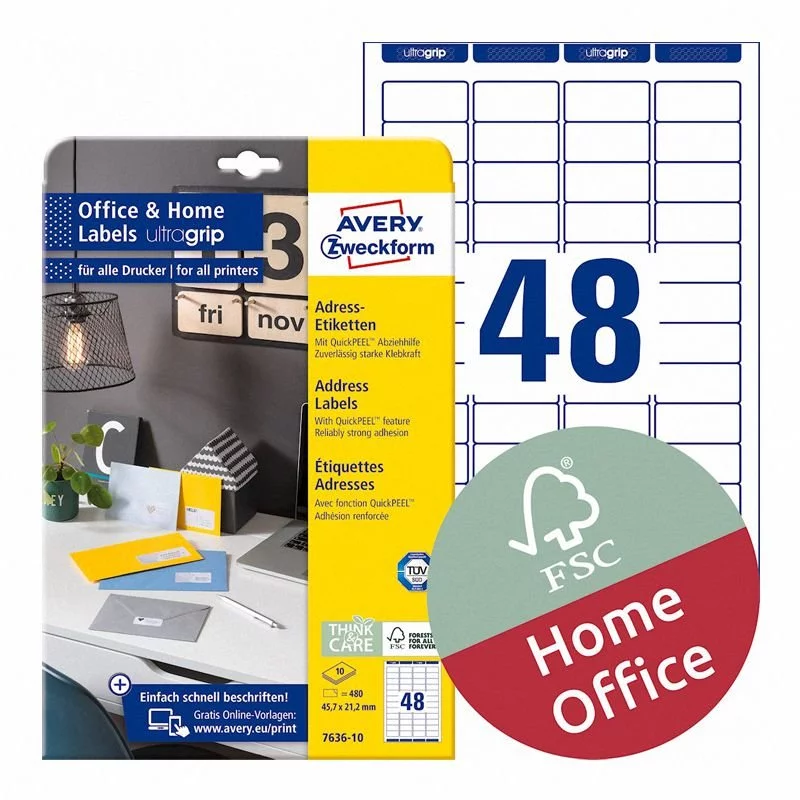Etykiety Adresowe Avery UltraGrip Office&Home 45,7x21,2 48/A4 A'10 Białe No.7636-10
