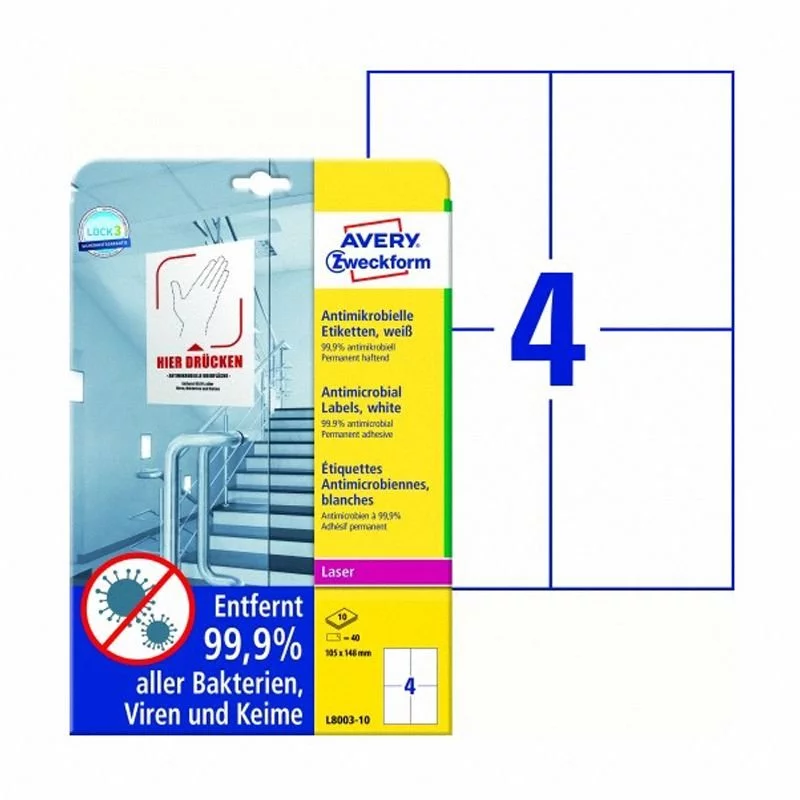 Folia Samoprzylepna z Powierzchnią Antydrobnoustrojową Avery 105x148 4/A4 A'10 Biała No.L8003-10