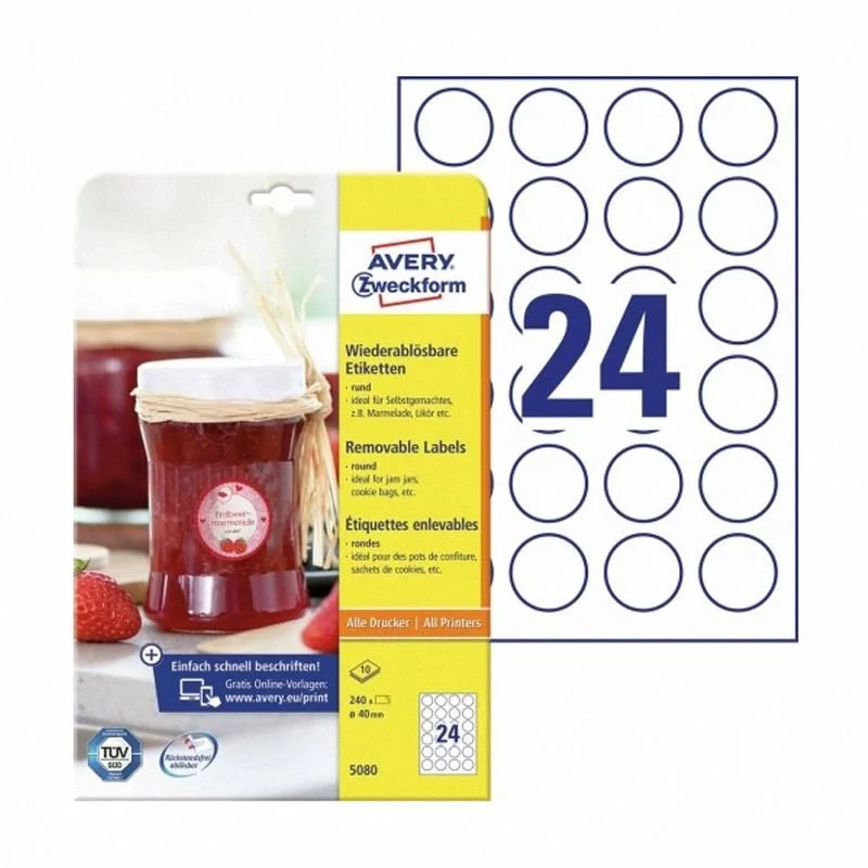 Etykiety na Słoiki Okrągłe Usuwalne Avery śr.40 24/A4 A'10 Białe No.5080