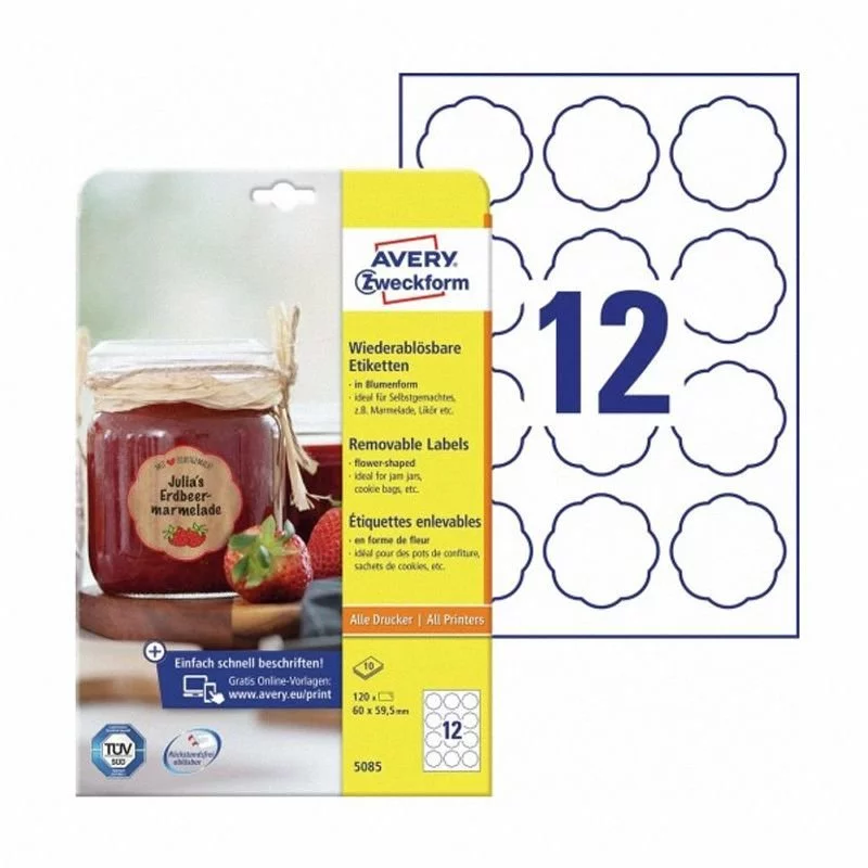 Etykiety na Słoiki Kwiat Usuwalne Avery 60 x 59,5 12/A4 A'10 Białe No.5085