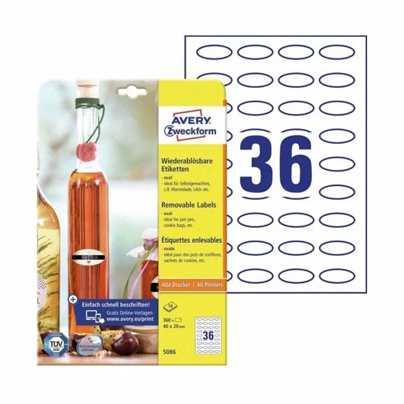 Etykiety na Butelki Owalne Usuwalne Avery 40X20 36/A4 A'10 Białe No.5086